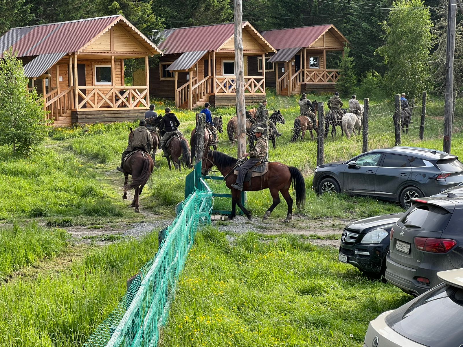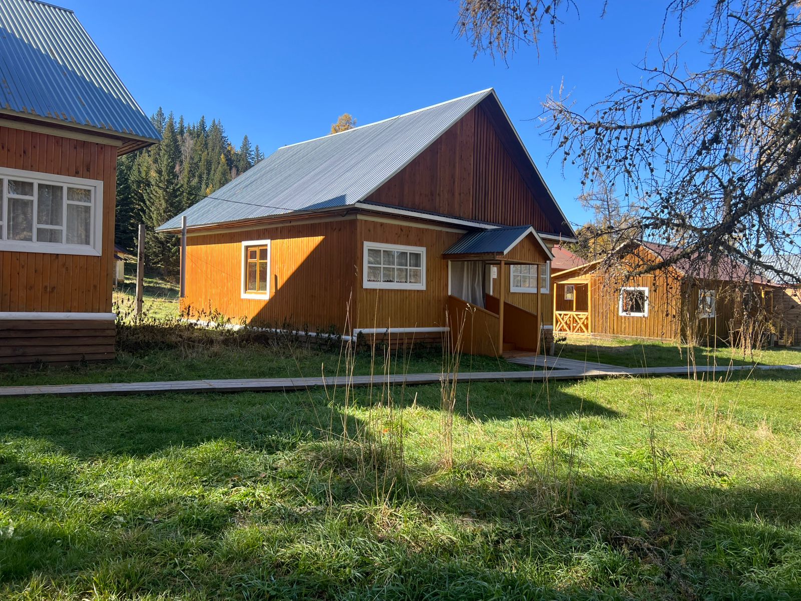 Территория базы отдыха большая, расположена в долине между небольшими горами, поросшими лиственницей, елями и кедром. Из окон домиков открывается вид на лес и горы. Домики обшиты деревом, внутри очень чисто и уютно.